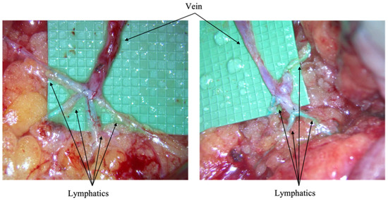 Reconstructive surgeons currently utilize immediate lymphatic reconstruction (ILR) to reduce the risk of postoperative lymphedema. ILR employs a lymphatic microsurgical preventative healing approach (LYMPHA), a microsurgical intervention that involves creating lymphovenous bypasses at the time of ALNDs [10,11,12]. The LYMPHA procedure creates an anastomotic bypass with a standard microsurgical technique between a lymphatic channel and vein (Figure 1) to allow for continued lymph flow and prevent localized pooling. Few studies have demonstrated promising results with ILR, yet they have limited cohort sizes and short follow-up periods [13,14]. The goal of developing ILR is to employ surgical techniques to decrease the incidence of lymphedema and improve post-operative outcomes. The aim of this study is to assess if ILR is an appropriate procedure for the prophylactic treatment of lymphedema in patients who have undergone axillary node dissections with and without ILR for the treatment of breast cancer.
