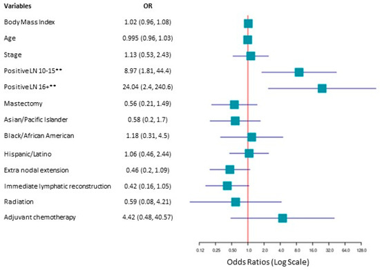 Odds ratio plot depicting demographic and clinical variables with the number of positive lymph nodes as a categorical variable. Body mass index and age were continuous variables. Stage compared stage 2 vs. stage 3; the reference category was stage 2. Positive lymph nodes with 0–9 +LN were used as a reference category. Mastectomy: yes vs. no, with no as a reference category. Race/ethnicity is presented with Non-Hispanic white as the reference category. Extranodal extension: no vs. yes, with no as a reference category. Immediate lymphatic reconstruction: no vs. yes, with no as a reference category. Radiation: no vs. yes, with no as the reference category. Adjuvant chemotherapy: no vs. yes, with no as the reference category. ** p < 0.01 was deemed statistically significant.