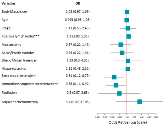 Odds ratio forest plot depicting demographic and clinical variables with the number of positive lymph nodes as a continuous variable. Body mass index and age were continuous variables. Stages compared stage 2 vs. stage 3: the reference category was stage 2. Positive lymph nodes were a continuous variable. Mastectomy: yes vs. no, with no as a reference category. Race/ethnicity: Non-Hispanic white was the reference category. Extranodal extension: no vs. yes, with no as the reference category. Immediate lymphatic reconstruction: no vs. yes, with no as the reference category. Radiation: no vs. yes, with no as the reference category. Adjuvant chemotherapy: no vs. yes, with no as the reference category. * p < 0.05; *** p < 0.001.