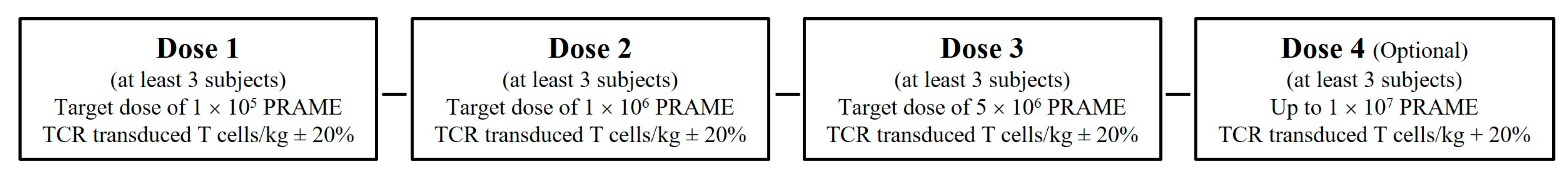 - Wermke, M.; Araujo, D.M.; Chatterjee, M.; Tsimberidou, A.M.; Holderried, T.A.W.; Jazaeri, A.A.; Reshef, R.; Bokemeyer, C.; Alsdorf, W.; Wetzko, K.; et al. Autologous T cell therapy for PRAME+ advanced solid tumors in HLA-A*02 + patients: A phase 1 trial. Nat. Med. 2025, 31, 2365–2374. [Google Scholar] [CrossRef]