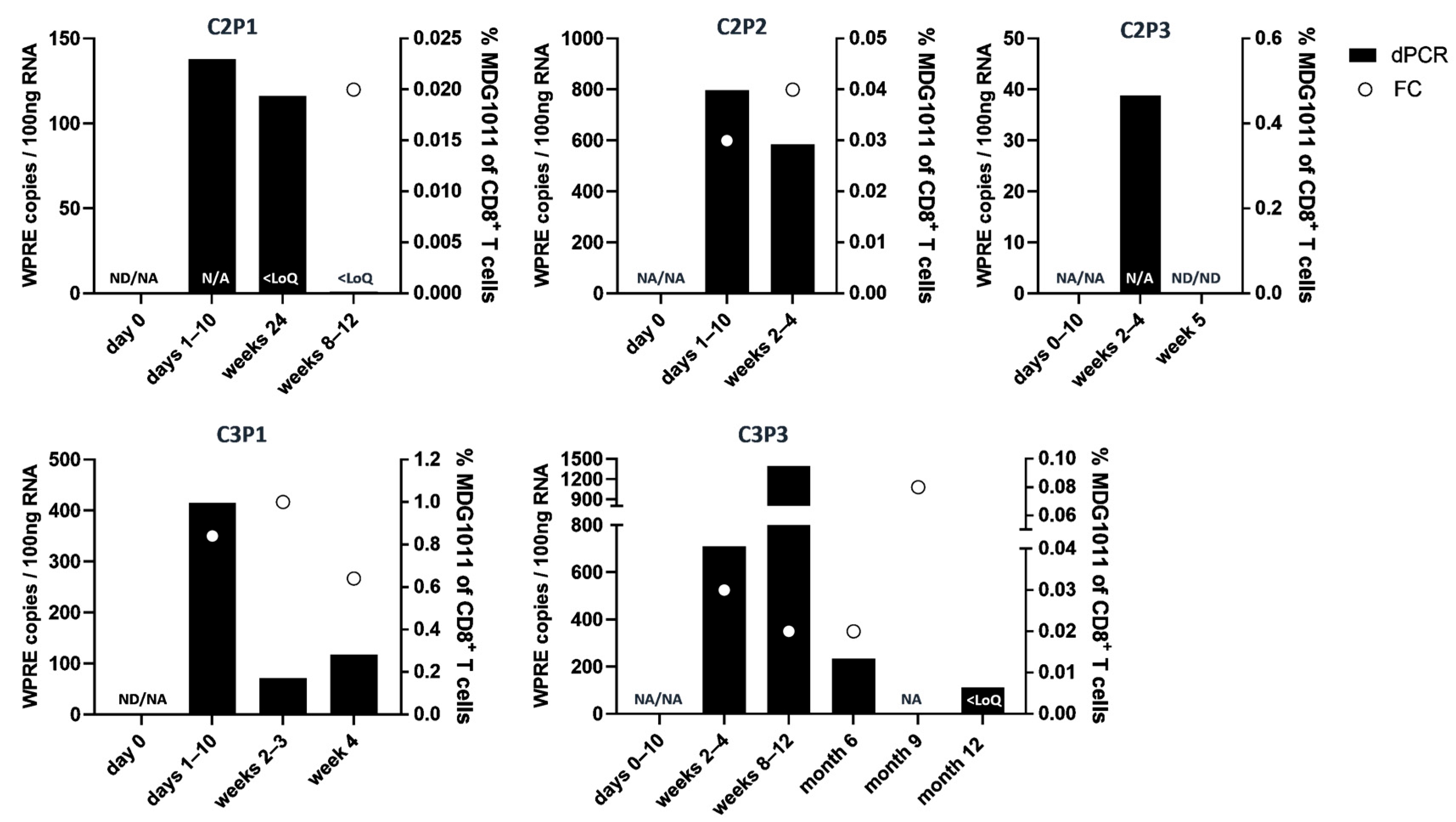 | PRAME mRNA at Week 4 | 545 | 6607 | 300 a | 424 | <LoQ | 112 | 1059 | 11,087 a | <LoQ b |