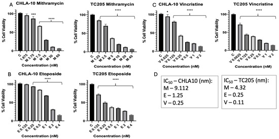 Monotherapy and IC50 values of CHLA-10 and TC205 ES cell lines. Cell viability results are shown for varying concentrations of monotherapy treatments of Mithramycin (Mit) and Etoposide (Eto) (A–C). M: Mithramycin; E: Etoposide; V: Vincristine. IC50 values per drug per cell line are shown (D). Viability data represented are all 48 h treatments. Data were analyzed using one-way ANOVA; **** p < 0.0001, *** p < 0.0002, * p < 0.02.
