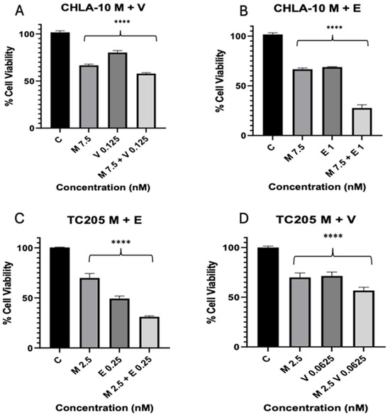 Combination treatments of CHLA-10 and TC205. ES cell lines treated with Mithramycin and Etoposide or Mithramycin and Vincristine (A–D). M: Mithramycin; E: Etoposide; V: Vincristine. Viability data represented are all 48 h treatments. Data were analyzed using one-way ANOVA; **** p < 0.0001.