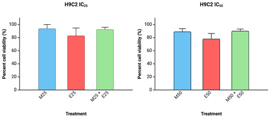 Treatment effects on cardiomyocyte cell line. H9C2 cells after treatments with IC25 and IC50 doses. Mithramycin, Etoposide, and Vincristine are indicated with M, E, and V, respectively. Viability data represent 48 h treatments. Data were analyzed using one-way ANOVA.