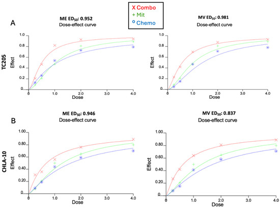 To study further treatment interactions, drug effect analysis using Calcusyn provided ED50 values and representative dose-effect curves to determine whether the combination produced a synergistic, antagonistic, or additive response. Details of the combination index calculation were well established and described earlier [11]. Treatment concentrations were set in a constant-ratio design and analyzed using CellTiter-Glo (Figure 4). In both CHLA10 and TC205 Mit combinations with Eto and VCR exhibited ED50 values <1, indicating synergistic drug responses in each case [12].