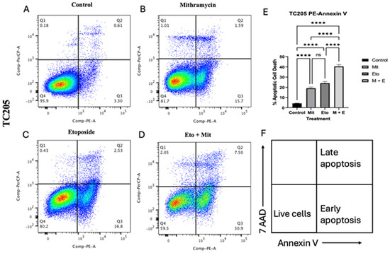Effect of Mithramycin and Etoposide on apoptosis. Annexin V-PE/7-AAD flow cytometry plots and quantified results following 48 h treatment with IC25 doses for TC205 cells (A–D). M: Mithramycin; E: Etoposide; V: Vincristine. Quantification of percept apoptotic cell death (E). Representative diagram of apoptosis using Annexin V-PE/7-AAD staining (F). Flow cytometry plots show the density gradient in the cell populations, with red representing highest population density, and blue representing the lowest population density. Data were analyzed using one-way ANOVA; **** p < 0.0001.