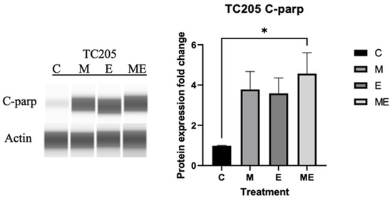 Effect of Mithramycin and Etoposide on c-PARP expression. c-PARP expression was measured via Simple Western Jess system, and quantification for TC205 protein following 48 h treatment with IC25 doses was obtained in GraphPad Prism from at least 3 independent runs. M: Mithramycin; E: Etoposide; ME: Mithramycin + Etoposide. Data were analyzed using one-way ANOVA, * p < 0.03.