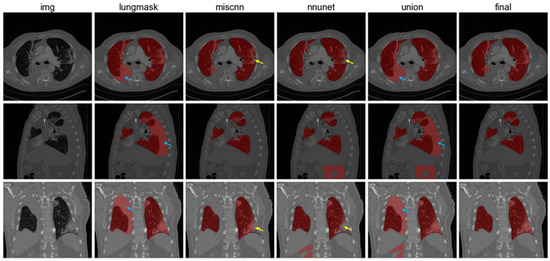 Lung segmentation results. From left to right: CT images, Lungmask segmentation, COVID-19 MIScnn, nnUNet, union results, and final results after manual correction. Blue arrows show false positive regions and yellow arrows demonstrate false negative regions.