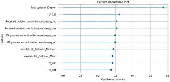 We conducted a feature importance analysis and explored those features that contributed most to the prediction results. Figure 3 shows a feature importance plot of the most important features. Among the top ten most contributive features, there are five clinical, three deep-learning, and two radiomic features. It can be seen that the most influential predictor is the feature “total cycles of IO given,” with a much larger importance value than the rest, indicating the model’s performance degrades the most when this variable is permuted, so it is the primary driver of predictions. Other contributors cluster closely with moderate importances—such as categorical indicators created by one-hot encoding (for example, “received radiation prior to immunotherapy:_yes/no”; “IO given concurrently with chemotherapy:_yes/no”) and several radiomic features (e.g., wavelet-LLL_firstorder_Minimum, df_223)—suggesting these add incremental signals beyond the dominant feature but are partially redundant with each other.