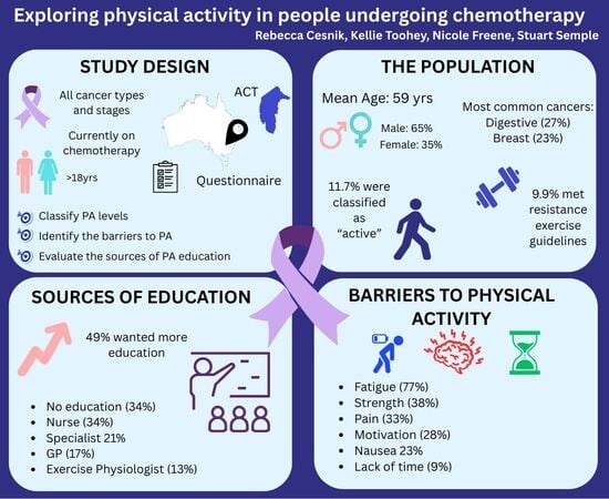 Cesnik, R.; Toohey, K.; Freene, N.; Semple, S. Exploring Physical Activity Levels, Barriers, and Education Sources in People with Cancer Undergoing Chemotherapy. Cancers 2025, 17, 2987. https://doi.org/10.3390/cancers17182987