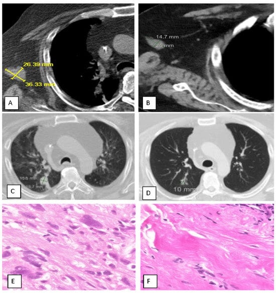 Case Study of a Patient Successfully Treated with MITI for Metastatic Fibrosarcoma. (A,C,E), Before treatment; (B,D,F), After treatment. CT SCAN: Left arm stump mass. (A): 36.3 × 26.4 mm = 958.2 mm2 (abnormal; all cancer); (B): 25 × 14.7 mm = 367 mm2 (substantial shrinkage; complete resolution of cancer according to biopsy (see (F), below)). CT SCAN: Lung, Right Lower Lobe mass. (C): 19.7 × 15.5 mm = 305.4 mm2 (abnormal); (D): 10 × 8 mm = 80 mm2 (normal) (substantial shrinkage; complete resolution of cancer); Biopsy Histopathology: Left Arm Stump. (E): Cancer: Myxoid Fibrosarcoma; (F): Benign Fibrous Pseudotumor.