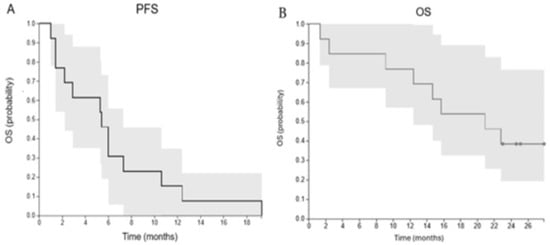 Median progression-free survival (PFS) and 95% confidence intervals (95% CI) were 5.4 months (1.8 to 23.1 months) (Figure 2), although PFS is a challenging endpoint in the context of immunotherapy due to confounding pseudoresiduum or pseudoprogression. The median OS and 95% CI were 20.9 months (9.1 to 22.8 months) (Figure 2).