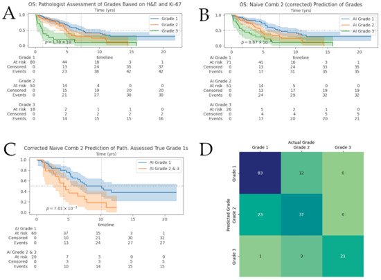Survival analyses and grade-prediction confusion matrix. Shaded areas surrounding survival curves represent 95% confidence intervals. At-risk tables broken-down by grade can be found under the corresponding Kaplan–Meier curves. (A) Survival of NENs: pathologist-assessed grades based on H&E and Ki-67; (B) Kaplan–Meier curves for our extended framework; (C) Kaplan–Meier curves for AI-predicted grades of pathologist-assessed G1s; (D) Confusion matrices for our framework on the full cohort. Numbers displayed are absolute counts.
