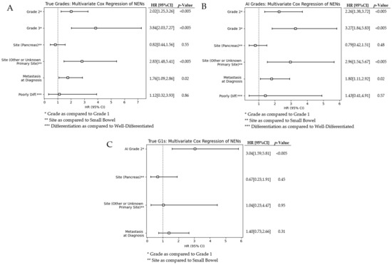 (A) Multivariate analysis of pathologist-true NEN grades; (B) Multivariate analysis of our framework-graded NENs; (C) Forest plot of AI-graded true G1s.