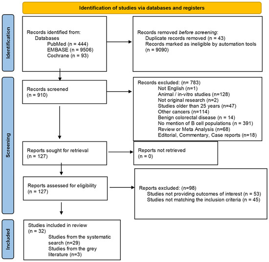 We conducted a systematic review adhering to the Preferred Reporting Items for Systematic Reviews and Meta-Analyses (PRISMA) guidelines. The review has been registered on the PROSPERO registration platform, reference number PROSPERO 2025 CRD420251127077. A systematic search of the literature was conducted in PubMed (Medline), Embase and Cochrane Library databases, to identify reports published between January 2000 and July 2025, which addressed Tumor-Infiltrating B Lymphocytes presence in colon and rectal cancer immune microenvironment. In addition, we searched gray literature sources https://scholar.google.com (accessed on 12 June 2025); https://clinicaltrials.gov/ (accessed on 25 June 2025) to identify relevant publications. Initial screening was performed independently by two investigators (G.F and V.F) based on the titles and abstracts of the articles to identify ineligible reports using the Covidence systematic review software, Veritas Health Innovation, Melbourne, Australia. Potentially relevant reports were subjected to a full-text review by two investigators (G.F and V.F.), and the relevance of the reports was confirmed after the data extraction process. Disagreements were resolved by consultation with a third co-author (G.C.D). The search terms were composed as follows: ((“B lymphocytes” OR “B lymphocyte” OR “B-lymphocytes” OR “B cells” OR “B cell” OR “B-cell” OR “B-cells” OR “B cell subtypes” OR “CD73” OR “CD20” OR “CD19” OR “CD21” OR “CD27” OR “CD25” OR “CD38” OR “CD138” OR “CD71” OR “TIBs”) AND (“tumor-associated” OR “tumour-associated” OR “anti-tumor” OR “anti-tumour” OR “tumor-infiltrating” OR “tumor infiltrating” OR “tumour-infiltrating” OR “tumour infiltrating” OR “tumor-infiltrated” OR “tumor infiltration” OR “tumour infiltration” OR “infiltrating” OR “tertiary lymphoid”) AND (“colorectal cancer” OR “rectal cancer” OR “colon cancer” OR “colorectal carcinoma” OR “colon carcinoma” OR “rectal carcinoma” OR “colorectal tumor” OR “colon tumor” OR “rectal tumor” OR “colorectal tumour” OR “colon tumour” OR “rectal tumour”))