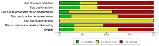 Two authors (G.F and V.F) independently assessed studies’ quality and the risk of bias using the robvis QUIPS tool version 0.3.0.900, available online at https://mcguinlu.shinyapps.io/robvis/ (accessed on 5 August 2025) [27] The assessed domains included: study participation, study attrition, prognostic factor measurement, outcome measurement, study confounding and statistical analysis and reporting. Disagreements in bias assessment were resolved by consultation with a third co-author (G.C.D).