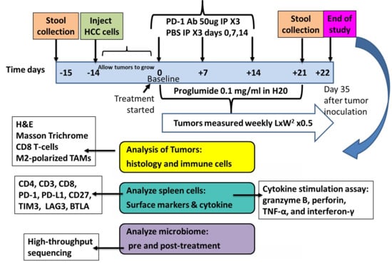 Experimental study design and treatments. C57BL/6 mice were inoculated subcutaneously with 100,000 HCC RIL-175 cancer cells on the right and left flank. When the mice had palpable tumors, they were randomized to one of 4 treatment groups with equal tumor size. Mice received PBS (control), proglumide (0.1 mg/mL in drinking water), PD-1Ab (50 μg, intraperitoneally), or combined therapy with proglumide and PD-1Ab. PD-1Ab and PBS were given on days 0, 7, and 14. PD-1Ab and PBS treatments were given in a volume of 100 μL by the intraperitoneal route. Stool samples were collected before tumor inoculation and the treatment for baseline and at the end of the study for microbiome analysis.