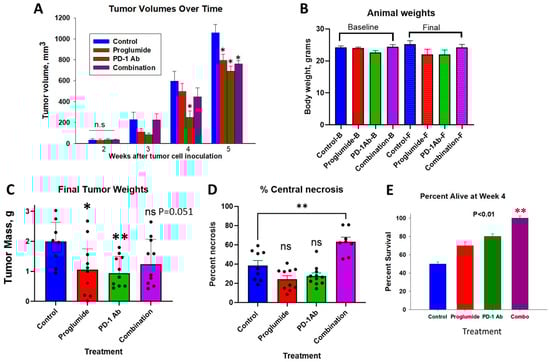 Tumor volumes were equal in all treatment groups at baseline, which was 14 days after tumor cell inoculation. Over the treatment period, mice treated with either proglumide or PD-1Ab monotherapy or with proglumide in combination with PD-1Ab had smaller tumor volumes than those in the control group (Figure 2A). There were no significant changes in animal body weights over the course of the study (Figure 2B).