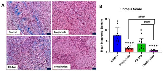 Masson’s trichrome staining showed extensive fibrosis of the HCC tumor microenvironment in control tumors. Less fibrosis was observed by Masson’s trichrome staining in the tumors from mice in all the treatment groups with the greatest difference observed in proglumide-treated mice (Figure 3A). Computer analysis by densitometry confirmed a statistically significant decrease in collagen staining compared to controls for each treatment group (Figure 3B) and a synergistic effect was noted in the tumors of the mice treated with both proglumide and the PD-1Ab (i.e., the combination) therapy group in comparison to the control and respective monotherapies (Figure 3B).