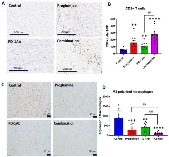 Immunosuppressive M2-polarized tumor-associated macrophages (TAMs) were abundant in the tumors of control mice. Representative images from each treatment group are shown in Figure 4C. The number of immunoreactive arginase+ M2-polarized TAMs was counted per HPF and plotted in Figure 4D. There were 3.1-fold fewer M2-polarized TAMs in the tumors of mice treated with proglumide and a 2.1-fold decrease in M2-polarized TAMs in tumors of mice treated with PD-1Ab monotherapy. However, the number of M2-polarized TAMs was significantly decreased by 8.7-fold in the tumors of mice treated with the combination regimen compared to controls suggesting a synergistic effect.