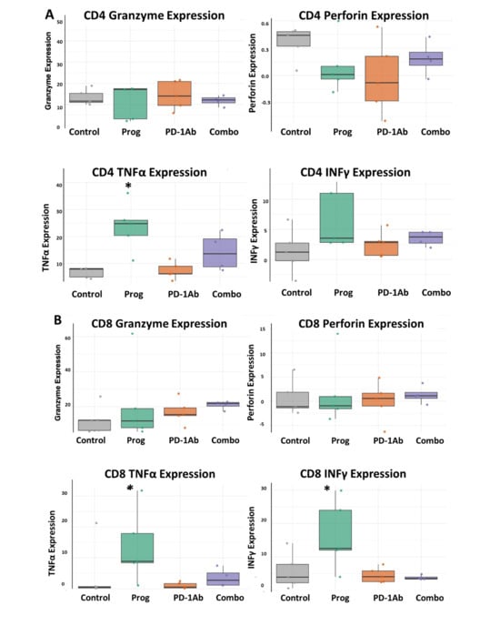 Cytokine release from T-cells from treatment groups compared to controls. (A) Cytokine release from mouse CD4 T-cells is shown for each treatment group compared to controls. Cytokines measured included granzyme, perforin, TNFα, and INFγ. (B) Cytokine release from CD8 T-cells after stimulation for granzyme, perforin, TNFα, and INFγ is shown. Box plots show the expression levels of CD4+ and CD8+ T-cell cytokine release from spleen lymphocytes of mice in each group. Boxes indicate the interquartile range (IQR), the horizontal line within each box denotes the median and the whiskers represent the range. * p < 0.05.
