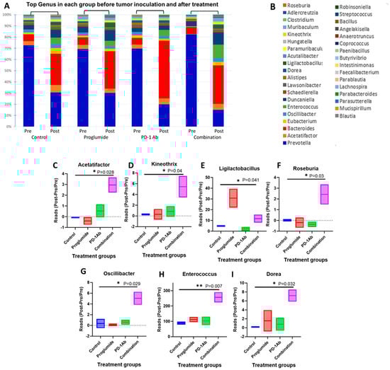 Combination therapy alters the gut microbiome. Microbiome analysis of mouse feces by whole-genome 16s sequencing of mice is shown in control, proglumide, PD-1Ab and proglumide in combination with the PD-1Ab before and after the treatment period. (A) The mean number of reads represented as percentage in stacked columns for the top 36 bacteria genus for each group is shown pre-treatment and post-treatment. (B) A list of the represented genus by name with color coding is shown and correlates with the figure in A. Significant changes in bacteria from baseline values compared to after treatments are shown for the following bacteria genus: (C) Acetatifactor; (D) Kineothrix; (E) Ligilactobacillus; (F) Roseburia; (G) Oscillibacter; (H) Enterococcus; and (I) Dorea. Significant differences between the groups by one-way ANOVA * p < 0.05, ** p < 0.01. The dotted line in C, D, F, and G shows the zero value.