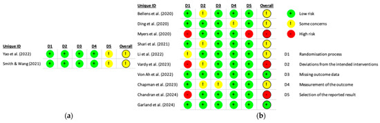 Summary of risk of bias for studies included in (a) the Systematic Review [24,34] and (b) the Systematic Review and Meta-analysis [23,25,26,27,28,29,30,31,32,33].