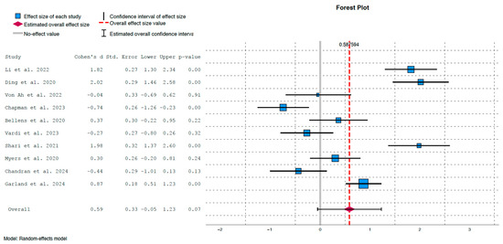 The results of the meta-analysis examining the effects of cognitive stimulation interventions indicate a moderate overall effect size (Cohen’s d = 0.59), suggesting potential benefits for cognitive functioning in BC patients experiencing CRCI. However, this effect did not reach statistical significance (p = 0.07), and the wide confidence interval (95% CI: −0.05 to 1.23) warrants caution in interpreting the magnitude of the benefit. Although the observed effect trends positively, the high degree of between-study variability may partly explain the lack of significance.