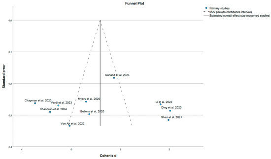 Funnel plot of standard errors and effect sizes [23,25,26,27,28,29,30,31,32,33].