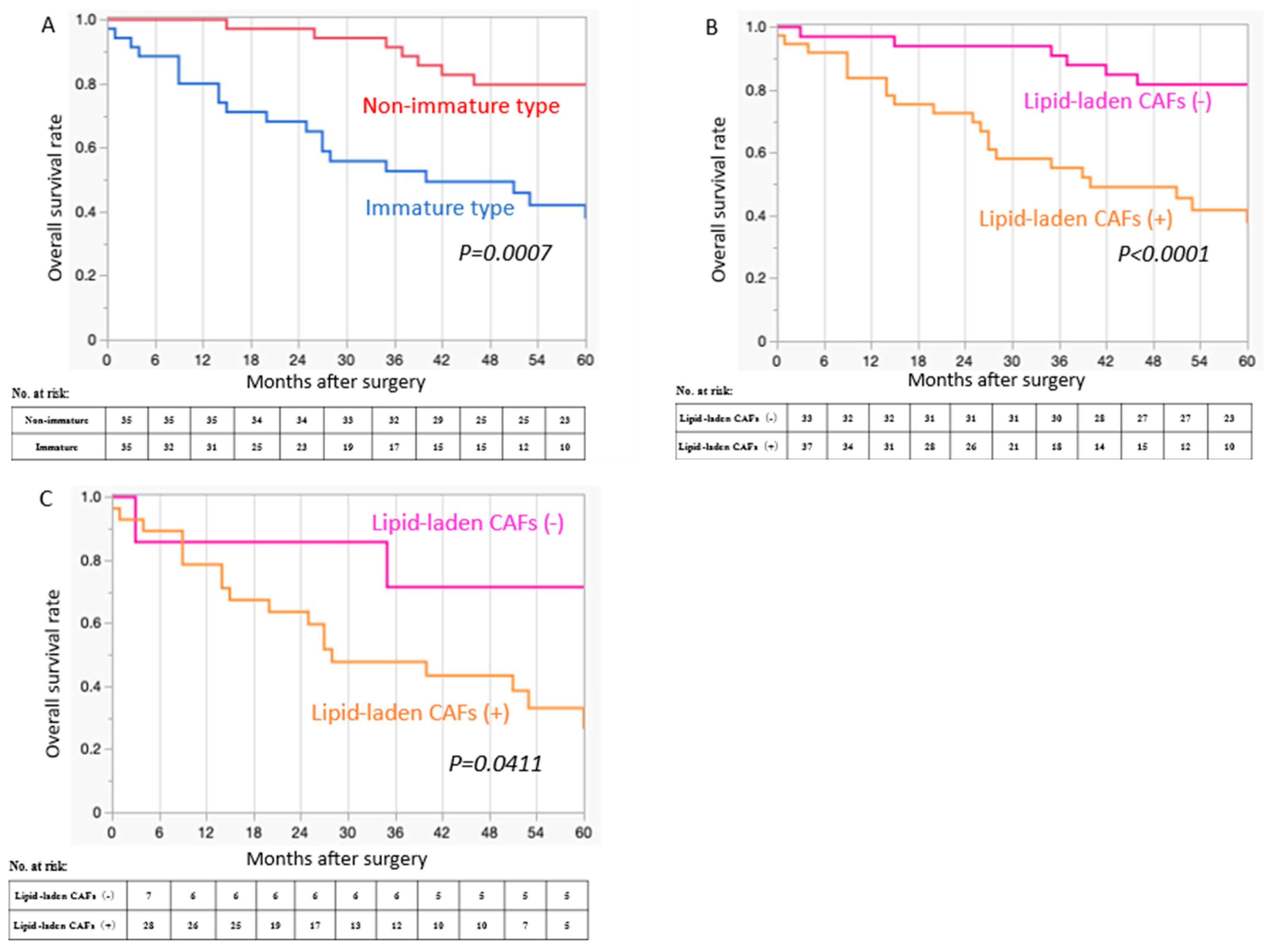 Presence of lipid-laden cancer-associated fibroblasts | 23 (77) | 14 (35) | 0.0005 | 0.0368 | 3.65 | 1.082–13.038 |