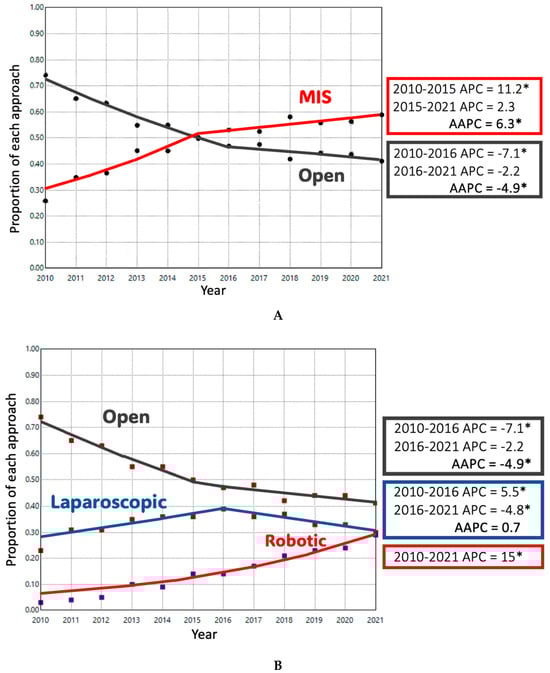 (A) Proportion of Open vs. Minimally Invasive Surgical (MIS) Approaches for Distal Pancreatectomy in the NCDB. APC: Annual Percent Change; AAPC: Average Annual Percent Change; *: p-value < 0.05. (B) Adjusted Trends of Open, Laparoscopic, and Robotic Distal Pancreatectomy Approaches in the NCDB.