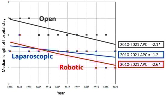 Trends in the Median Length of Hospital Stay in Distal Pancreatectomy by Surgical Approach; *: p-value < 0.05.