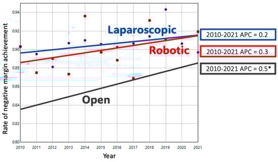 Trends in Negative Margin (R0) Achievement in Distal Pancreatectomy by Surgical Approach; *: p-value < 0.05.