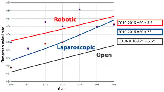 Trends in the Five-Year Survival Rate for Minimally Invasive Distal Pancreatectomy by Surgical Approach; *: p-value < 0.05.