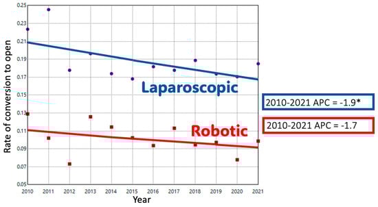 Trends in Conversion in Minimally Invasive Distal Pancreatectomy by Surgical Approach; *: p-value < 0.05.
