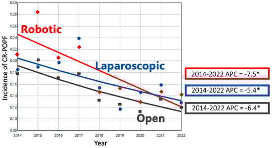 Trends in Clinically Relevant Postoperative Pancreatic Fistula (CR-POPF) Rates in Distal Pancreatectomy by Surgical Approach (NSQIP); *: p-value < 0.05.