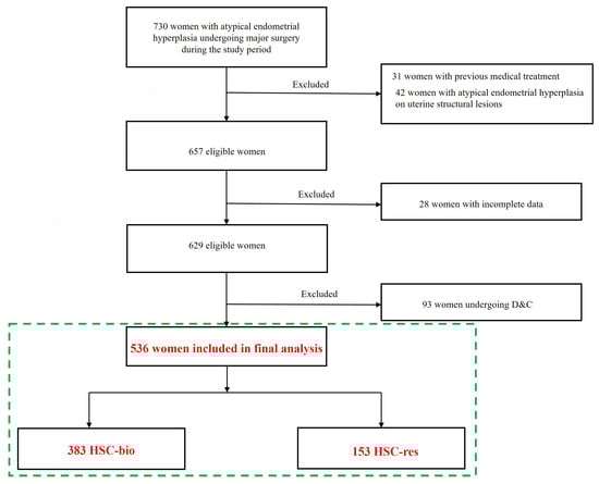 - Giannella, L.; Delli Carpini, G.; Sopracordevole, F.; Papiccio, M.; Serri, M.; Giorda, G.; Tsiroglou, D.; Del Fabro, A.; Ciavattini, A. Atypical Endometrial Hyperplasia and Unexpected Cancers at Final Histology: A Study on Endometrial Sampling Methods and Risk Factors. Diagnostics 2020, 10, 474. [Google Scholar] [CrossRef] [PubMed]