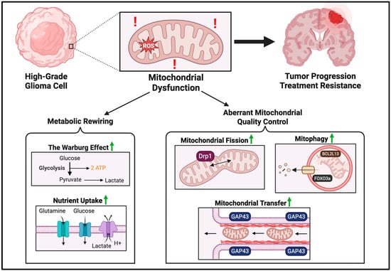 Mitochondrial dysfunction drives glioma progression and treatment resistance. Mitochondrial dysfunction involves both metabolic rewiring and aberrant quality control. Metabolic rewiring is characterized by the Warburg effect, a reliance on glycolysis even in the presence of oxygen. To meet metabolic demands, glioma cells upregulate glucose and glutamine influx, while removing excess lactate. Mitochondrial quality is controlled in several ways: mitochondrial transfer from adjacent cells via tunneling actin nanotubules, upregulation of mitochondrial fission, and general upregulation of mitophagy levels. Red exclamation symbols are used to represent mitochondrial dysfunction. Green arrows are used to represent upregulation. The image was created with BioRender.com (accessed on 25 August 2025).