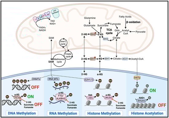 Glioma exhibits strong pathogenic crosstalk between mitochondrial function and epigenetic regulation, which can be exploited through mitochondrial-targeting strategies. This interplay is mediated by key mitochondrial metabolites that serve as substrates or cofactors for epigenetic enzymes, as illustrated in Figure 2.