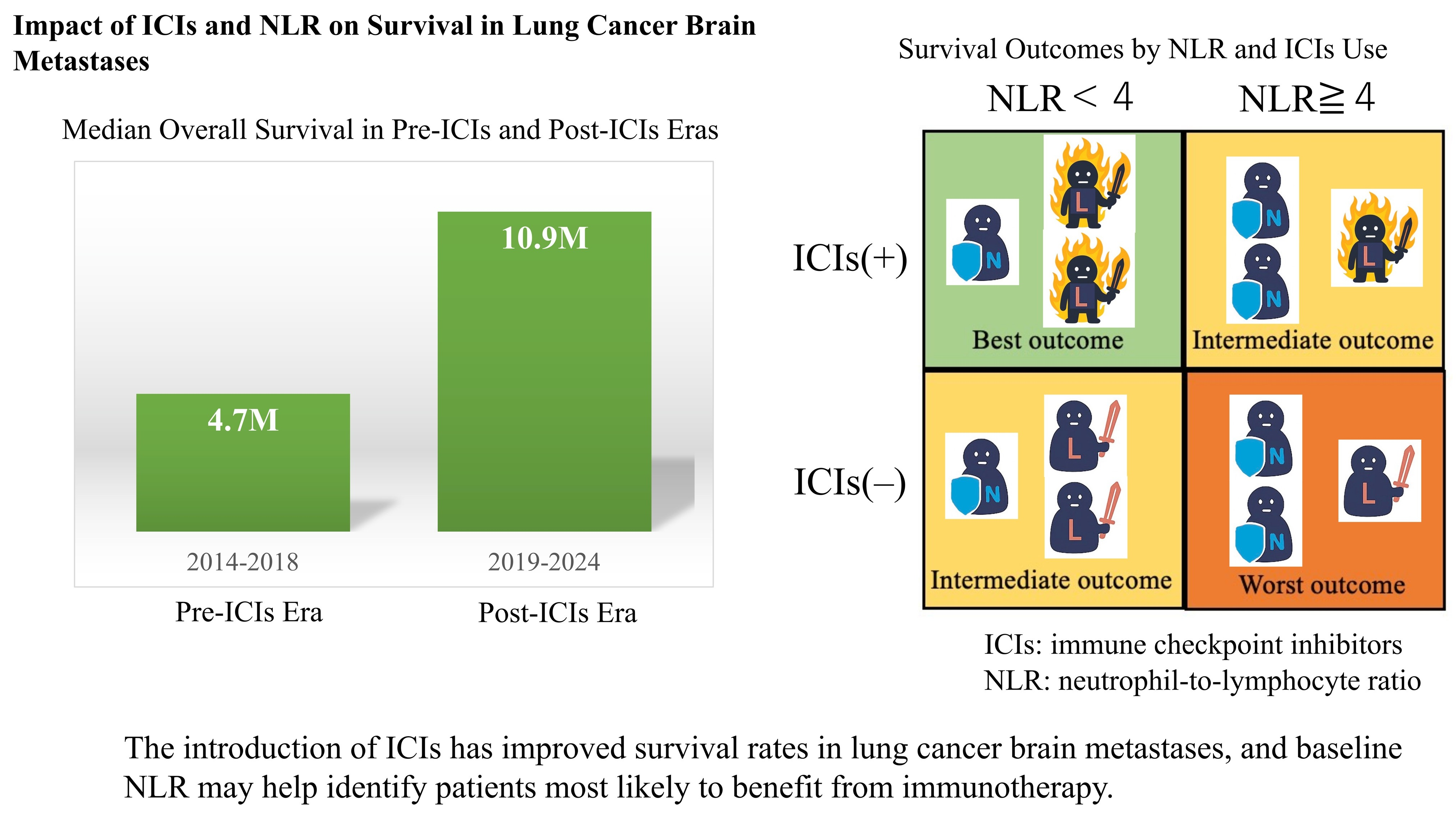 In this study, we compared the clinical characteristics and treatment outcomes of patients with BM from lung cancer before and after the introduction of ICIs, with a particular focus on the prognostic value of NLR.