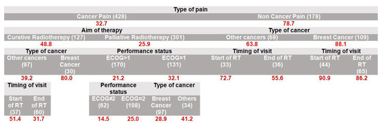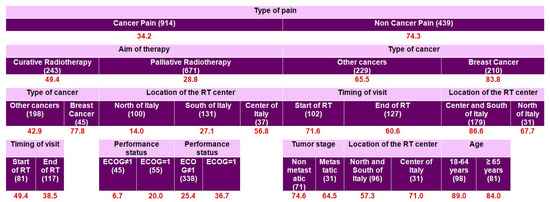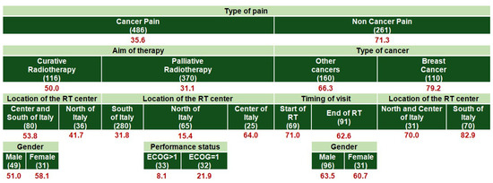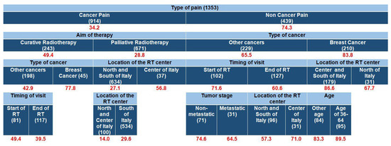 - Donati, C.M.; Nardi, E.; Zamagni, A.; Siepe, G.; Mammini, F.; Cellini, F.; Di Rito, A.; Portaluri, M.; De Tommaso, C.; Santacaterina, A.; et al. Adequacy of Pain Treatment in Radiotherapy Departments: Results of a Multicenter Study on 2104 Patients (Arise). Cancers 2022, 14, 4660. [Google Scholar] [CrossRef] [PubMed] [PubMed Central]