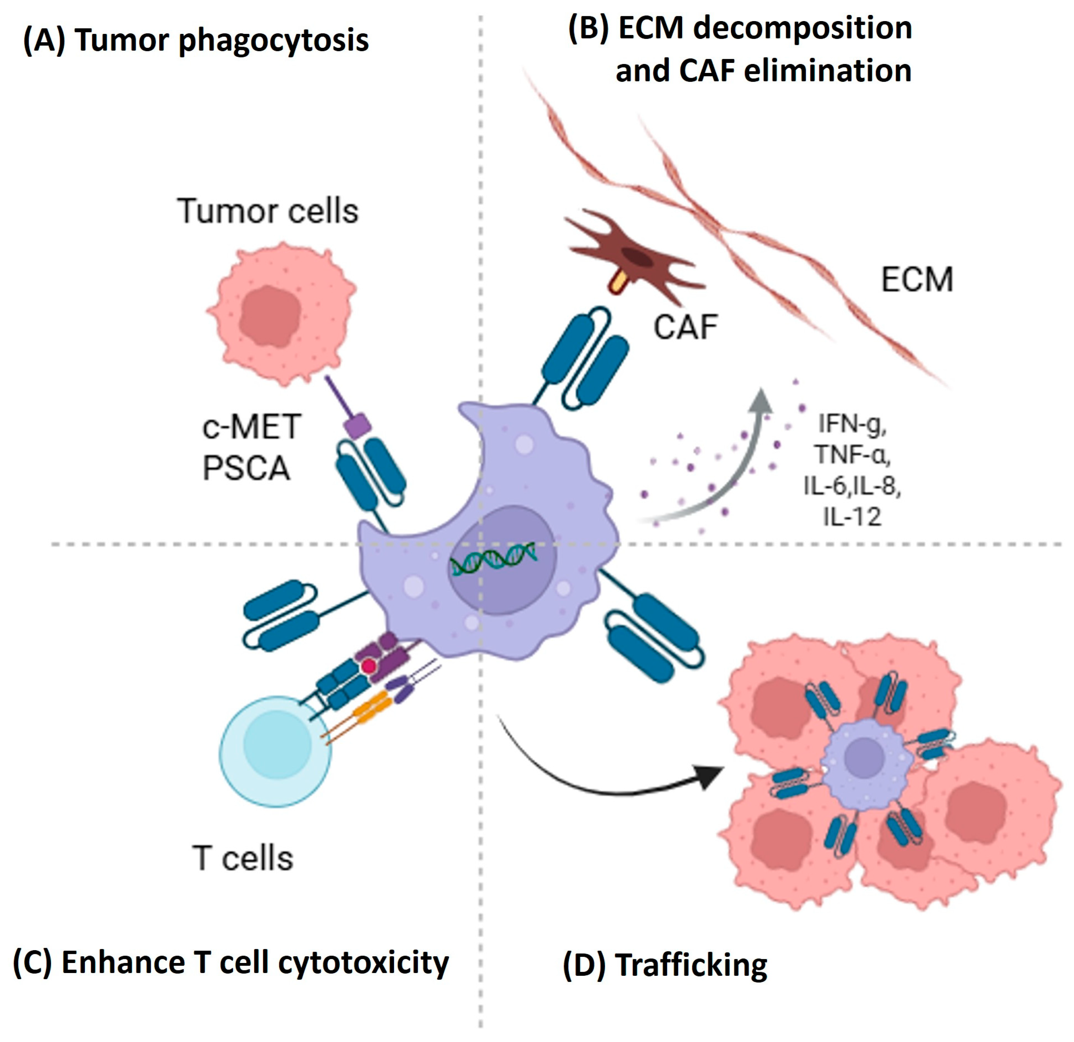 - Zhang, W.; Liu, L.; Su, H.; Liu, Q.; Shen, J.; Dai, H.; Zheng, W.; Lu, Y.; Zhang, W.; Bei, Y.; et al. Chimeric antigen receptor macrophage therapy for breast tumours mediated by targeting the tumour extracellular matrix. Br. J. Cancer 2019, 121, 837–845. [Google Scholar] [CrossRef]