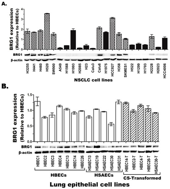 BRG1 mutation leading to its loss of protein expression or LOF is found in ~10% of cases of NSCLC and is a key diagnostic defect in ~100% of cases of SMARCA4-DTS, a thoracic cancer [4,7,8,44]. Both of these tumors are strongly associated with smoking, and NSCLC develops through the transformation of lung epithelial cells mainly by cigarette smoke (CS) [7,45]. Thus, this study first screened BRG1 mRNA and protein levels in 47 human lung epithelium-derived cell lines at different stages of malignancy (Supplementary Table S1). Immortalized human bronchial epithelial cell lines (HBECs, n = 7) and small airway epithelial cell lines (HSAECs, n = 5) were used to define normal BRG1 expression in human lung epithelia. These cell lines were selected because of their validated similarity to primary lung epithelial cells [46], while the long cell culture needed to generate and study BRG1-knockout (BRG1-KO) and/or CS-transformed (CST) lines in vitro without their undergoing senescence like normal primary lung epithelial cells was also allowed. The CST lines (n = 5) were generated via chronic (12-week) CS exposure of HBECs or HSAECs using our established protocol [32], and CST clones were selected based on their newly acquired anchorage-independent growth in soft agar, a hallmark of transformed cells [47]. The malignant NSCLC cell lines (n = 30) were established from tumors of different lung cancer patients. BRG1 mRNA and protein expression in each cell line was detected using gene-specific qPCR (TaqMan) and Western blot assays, using β-actin as an endogenous control. Although BRG1 mRNA was detected in all 47 cell lines evaluated, the level of expression in the NSCLC lines showed a wider variation range of 0.11–3.75-fold (Figure 1A, top panel, bar graph) compared to the relatively uniform expression (0.56–1.29-fold) in the immortalized and CST HBEC/HSAEC lines (Figure 1B, top panel). In contrast, BRG1 protein was barely or not detectable in 47% (14/30) of NSCLC cell lines (Figure 1A, bottom panel, Western blots) compared to BRG1 protein expression in all immortalized and CST HBECs and HSAECs (Figure 1B, bottom panel). The NSCLC cell lines that expressed little or no BRG1 protein mostly had significantly lower mRNA levels compared to the BRG1 protein-expressing lines (Figure 1A, black vs. dotted bars). While the BRG1 protein was mostly lost in the BRG1-mutant NSCLC cell lines (e.g., A549, H23, and H522), it was also seen in some BRG1-WT lines (e.g., Calu3; Table S1), likely due to non-genetic (epigenetic) silencing, as previously reported [25,48,49].