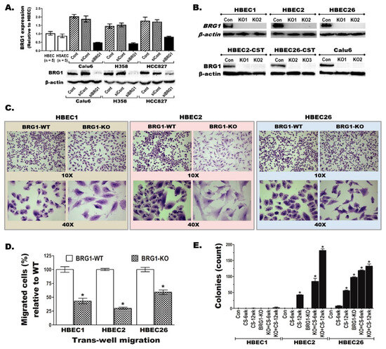 BRG1 knockout transforms normal lung epithelial cell lines. (A,B) BRG1 expression was (A) transiently knocked down (KD) using BRG1-specific siRNA or (B) stably knocked out (KO) using CRISPR-Cas9, and the reduced mRNA (bar graph) and reduced or complete loss of BRG1 protein expression (Western blots) is shown. (C–E) Loss of BRG1 in the BRG1-KO HBECs led to major changes in the (C) morphology, (D) trans-well migration, and (E) anchorage-independent growth capability in soft agar, indicating transformation of these HBECs into pre-malignant cells. The histology pictures in (C) were taken with the NanoZoomer® Slide Scanner System, and the images shown are 10× and 40× magnifications. * p < 0.05.