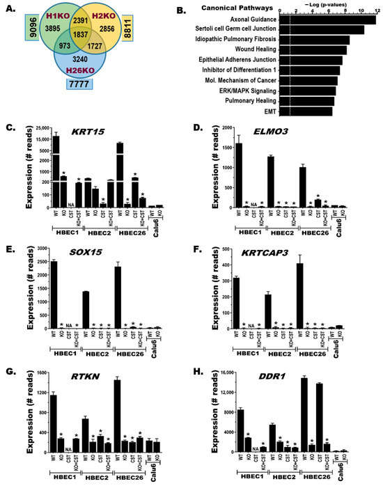 Our previous studies established that CS or tobacco carcinogens transform HBECs through major transcriptional and epigenomic reprograming [32,50]. The genome-wide gene expression was compared between BRG1-KO and BRG1-WT HBECs, CS-transformed HBECs (CSTs), and malignant (NSCLC) cell lines using RNA-sequencing. The results showed that BRG1-KO in HBECs induced significant (false discovery rate, FDR < 0.05) expression changes in 8561 ± 567 genes (mean ± SD) compared to the corresponding BRG1-WT controls (Figure 3A). These differentially expressed genes (DEGs) generally exhibited comparable levels of increased or decreased gene expression (Figure S2A and Table S2). A Venn diagram depicting the common and distinct BRG1-KO-induced DEGs between the three HBECs revealed that 1837 (~21%) were common (Figure 3A), while 2856 to 3895 (~33–45%) DEGs were distinct for each HBEC, potentially contributing to the heterogeneity BRG1-KO HBECs showed in transformation efficiency (Figure 2E). Similarly, RNA-seq analysis of HBECs compared to CST HBECs or BRG1-KO followed by CS-exposed (KO + CST, Kcst for short) HBECs also uncovered comparably large numbers of DEGs (means ± SDs: 7791 ± 3123 and 8001 ± 868, respectively) (Figure S2B). Venn diagrams depicting the commonality and uniqueness of the CST- or Kcst-induced DEGs between HBECs (Figure S2B) and the KO-, CST-, and Kcst-induced DEGs within each HBEC cell line (Figure S2C), as well as a heatmap depicting a subset of the expression changes between HBEC1 and -2 and two BRG1-KO clones from HBEC1 (Figure S2D), demonstrate the broad changes. Pathway analysis of common BRG1-KO-induced DEGs performed using Ingenuity pathway analysis software revealed that lung development, function, damage repair (healing, fibrosis, and cell–cell junctions), transformation, and cancer-related (axonal guidance, ERK/MAPK, and epithelial-to-mesenchymal transition) signaling pathways were most significantly affected (Figure 3B). The RNA-seq data for a subset of common DEGs within the top pathways were validated using independent quantitative gene-specific qPCR (TaqMan) assays (Figure 3C–H).