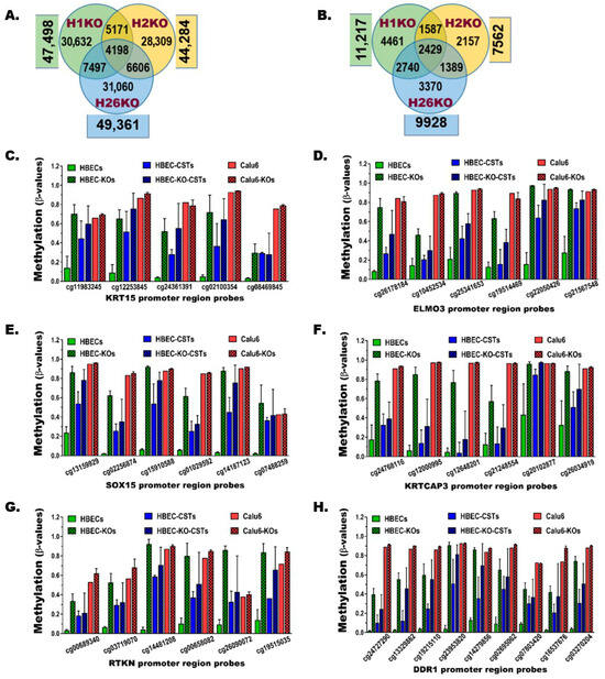 The impact of BRG1-KO on cytosine preceding guanine (CpG) DNA methylation was investigated using the Infinium MethylationEPICv2.0 BeadChip (EPICv2.0). Although EPICv2.0 interrogates the methylation of ~930,000 sites (probes) across the genome, our analysis for this study focused on ~390,000 probes located from the 1500 bp upstream of transcription start sites (TSS1500) to the 3′-end of the first exons, where most gene promoters reside. This is because CpG methylation in promoter regions blocks the binding of transcription factors, leading to repression or complete silencing of gene expression [39,51]. Using ≥20% changes in methylation as a threshold to define a differentially methylated probe (DMP), BRG1-KO in HBEC1, -2, and -26 cell lines led to 47,048 ± 2097 DMPs (mean ± SD), including 4198 DMPs common to all three HBECs (Figure 4A, Table S3). These DMPs (increased or decreased) are distributed across the genome (promoter regions of 24,236 ± 681 genes, mean ± SD), including 8436 genes in common between the three HBECs (Figure S3A). To focus on genes that are significantly repressed or completely silenced by CpG methylation, a hypermethylated gene (HMG) was defined in this study as a gene with ≥3 or ≥20% of all interrogated promoter probes showing ≥20% increased methylation. Based on this stringent definition, BRG1-KO in the three HBECs resulted in hypermethylation of 9569 ± 1854 genes, including 2429 that were common to all three (Figure 4B, Table S3). The increased methylation of multiple consecutive probes across the promoter regions of some of these HMGs is shown in Figure 4C–H. The complete silencing or significant repression of these HMGs following BRG1-KO (Figure 3C–H) clearly show the inverse relationship between promoter hypermethylation and gene expression. Similarly, dense CpG hypermethylation changes were found in BRG1-KO HBECs exposed to CS (Kcst) as well as BRG1-KO in NSCLC cell lines (Calu6 and H358) (Table S3, Figure S3B–D). The fact that BRG1-KO-induced hypermethylation changes in the HBECs were more extensive compared to the NSCLC cell lines likely stems from the fact that many of these changes were already established in the cancer cells prior to BRG1-KO (Calu6 in Figure 4C–H).