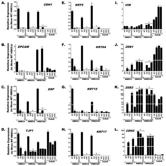 BRG1-LOF induces epithelial-to-mesenchymal transition (EMT). RNA-seq-uncovered changes in the expression of major regulators/markers of EMT genes (Figure S4) were confirmed using quantitative gene-specific expression (Taqman) assays. Downregulation of well-established epithelial marker (A–D) and many keratin (E–H) genes in the BRG1-KO compared to the BRG1-WT isogeneic control HBECs revealed that these cells lose their epithelial phenotype following BRG1-LOF. Conversely, the increased expression of many EMT inducer and mesenchymal marker genes (I–L) in the BRG1-KO cells compared to the WT controls indicates that BRG1-LOF leads HBECs to gain the mesenchymal phenotype. Similar to the other changes (see Figure 3 and Figure 4), these BRG1-KO-induced EMT changes clearly transform the HBECs towards the expression profiles found in CST and NSCLC cells. * p < 0.05. CS-exposure alone did not transform HBEC1, thus HBEC1 CST line is not available (NA).