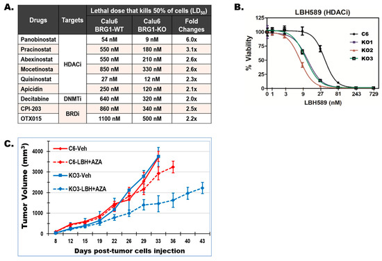 The potential impact of BRG1-KO and the resulting broad gene expression and epigenetic changes in sensitizing lung cancer cells to epigenetic therapy were screened using a library of 152 epigenetic drugs against BRG1-WT and KO Calu6 lines. The results revealed the increased sensitivity of BRG1-KO cells to various histone deacetylase (HDAC), bromodomain (BRD), and DNA methyltransferase (DNMT) inhibitors (Figure 6A). Among these, the universal HDAC inhibitor Panobinostat (LBH589) showed a 6-fold increased potency against BRG1-KO compared to BRG1-WT Calu6 cell lines. The lethal dose of LBH589 that kills 50% of the cells (LD50) was reduced from 54 nM against the BRG1-WT Calu6 cell line (C6) to an average of 9 nM (7–11 nM) against three different Calu6 BRG1-KO clones (KO1, KO2, and KO3; Figure 6B). Whether the increased in vitro sensitivity of BRG1-KO cells leads to meaningful in vivo efficacy was investigated using subcutaneous xenografts derived from BRG1-KO (KO3) versus BRG1-WT control (C6) Calu6 lines in nude mice. Based on our previous studies showing that HDAC and DNMT inhibitors produce better efficacy against lung cancer when used together [52], a combination of LBH589 and 5-Azacytidine (5-Aza) was used (Table S4). After one week of tumor growth, the mice bearing each tumor type (C6 or KO3) were treated 3 times/week for six consecutive weeks with intraperitoneal (i.p) injection of 0.5% (v/v) DMSO in DPBS (vehicle) or a combination of 4 mg/kg LBH589 and 2 mg/kg 5-Aza (LBH + AZA). Tumor growth and body weight were measured twice/week, and the mice were sacrificed at the end of the study, one week after the last (sixth) treatment, or earlier when the tumor volume exceeded 2000 mm3. The treatments were well-tolerated, and the mice bearing BRG1-KO (KO3)-derived tumors and treated with LBH + AZA showed the slowest tumor growth and longer survival compared to the other groups (Figure 6C). However, despite the increased sensitivity of BRG1-KO calu6 to both LBH589 and 5-AZA in vitro (Figure 6A,B) and the relatively smaller sizes of the BRG1-KO tumors in the LBH + AZA-treated mice (Figure S4), the effects were not significantly different and none of the treatments was able to arrest the highly aggressive growth of Calu6-derived tumors.