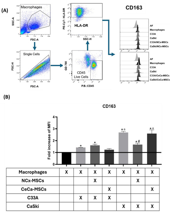 Macrophages from cocultures with CaSki/NCx-MSCs lowered the CD163 expression. To evaluate macrophage polarization toward an M2 phenotype, monocytes were cocultured for 3 days with tumor cells (C33A and CaSKi, cervical cancer cell lines) and MSCs derived from NCx and CeCa, and CD163 expression on the macrophages obtained was quantified by flow cytometry. (A) Flow cytometry selection strategy. Representative hierarchy of a sample starting from a population of macrophages obtained from coculture selecting CD45+HLA-DR+ populations. (B) Bar graphs of the fold increase relative to macrophage control for the M2 marker upon coculture with TCs or TCs/MSCs. Bar graphs represent the means with standard errors (n = 5). The black line indicates the control for comparison of the fold increase. The Kruskal–Wallis test followed by the Mann–Whitney U post hoc test was conducted. * Significant difference from control. # Significant difference from tumor line. ° Significant difference from NCx-MSCs. *, °, # Significant difference, p < 0.05. NCx-MSCs: normal cervix-derived mesenchymal stromal cells; CeCa-MSCs: cervical-cancer-derived mesenchymal stem cells; AF: autofluorescence; MFI: median fluorescence intensity.