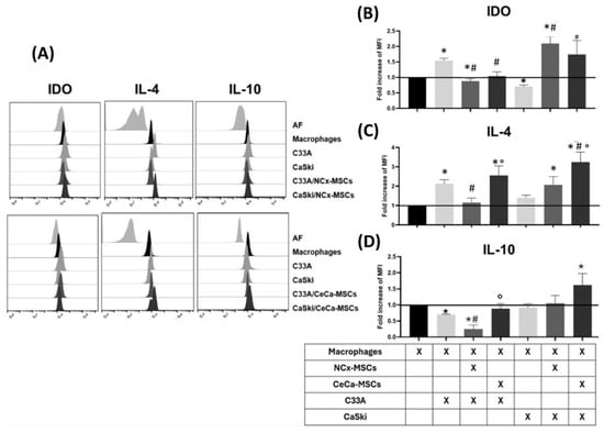 Macrophages from cocultures with TCs/CeCa-MSCs increased their intracellular expression of IL-4 and IL-10. To determine the effect of TCs/MSCs on the generation of intracellular molecules in macrophages, cocultures of TCs/MSCs/monocytes were performed for 3 days, and the expression of intracellular IL-4 and IL-10 in the macrophages obtained was analyzed by flow cytometry. (A) Representative histograms of the fold increase with respect to the macrophage control for intracellular expression of IDO, IL-4, and IL-10 in macrophages cocultured with TCs or TCs/MSCs. Bar graphs of the fold increase with respect to the macrophage control for intracellular expression of IDO (B), IL-4 (C), and IL-10 (D) in macrophages cocultured with TCs or TCs/MSCs. Bar graphs represent the means with standard errors (n = 5). The black line indicates the control to compare the fold increase in MFI. The Kruskal–Wallis test followed by the Mann–Whitney U post hoc test was conducted. * Significant difference with respect to the control. # Significant difference with respect to tumor line. ° Significant difference with respect to NCx-MSCs. *, #, ° Significant difference, p < 0.05. TCs: tumor cells; C33A and CaSKi: cervical cancer cell lines; NCx-MSCs: normal cervix-derived mesenchymal stromal cells; CeCa-MSCs, cervical-cancer-derived mesenchymal stem cells; AF: autofluorescence; MFI: median fluorescence intensity.
